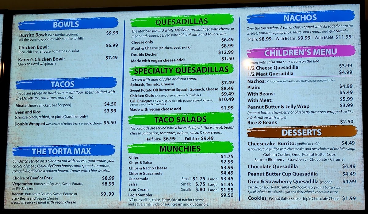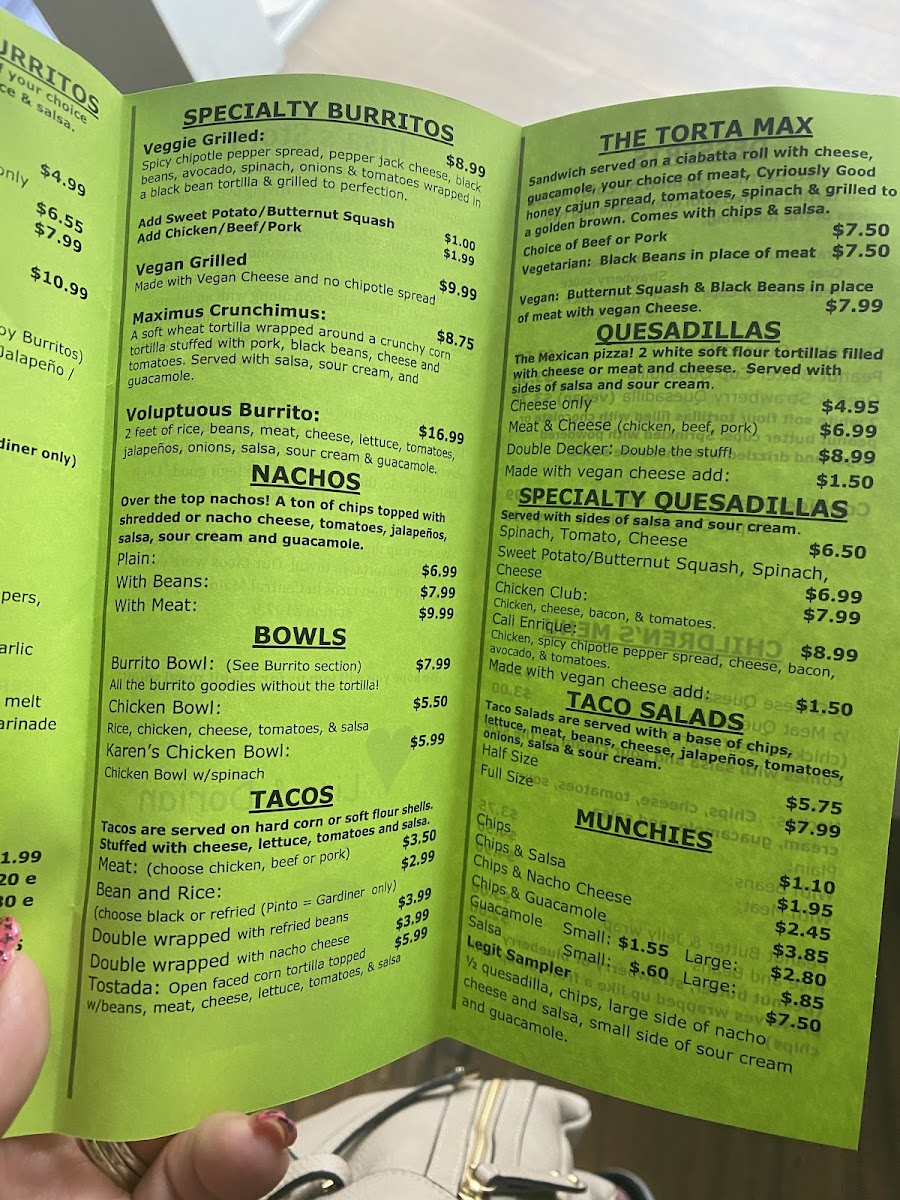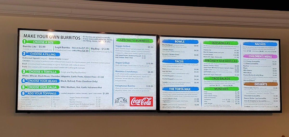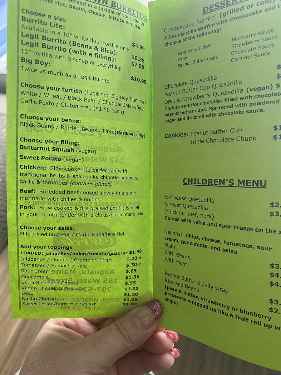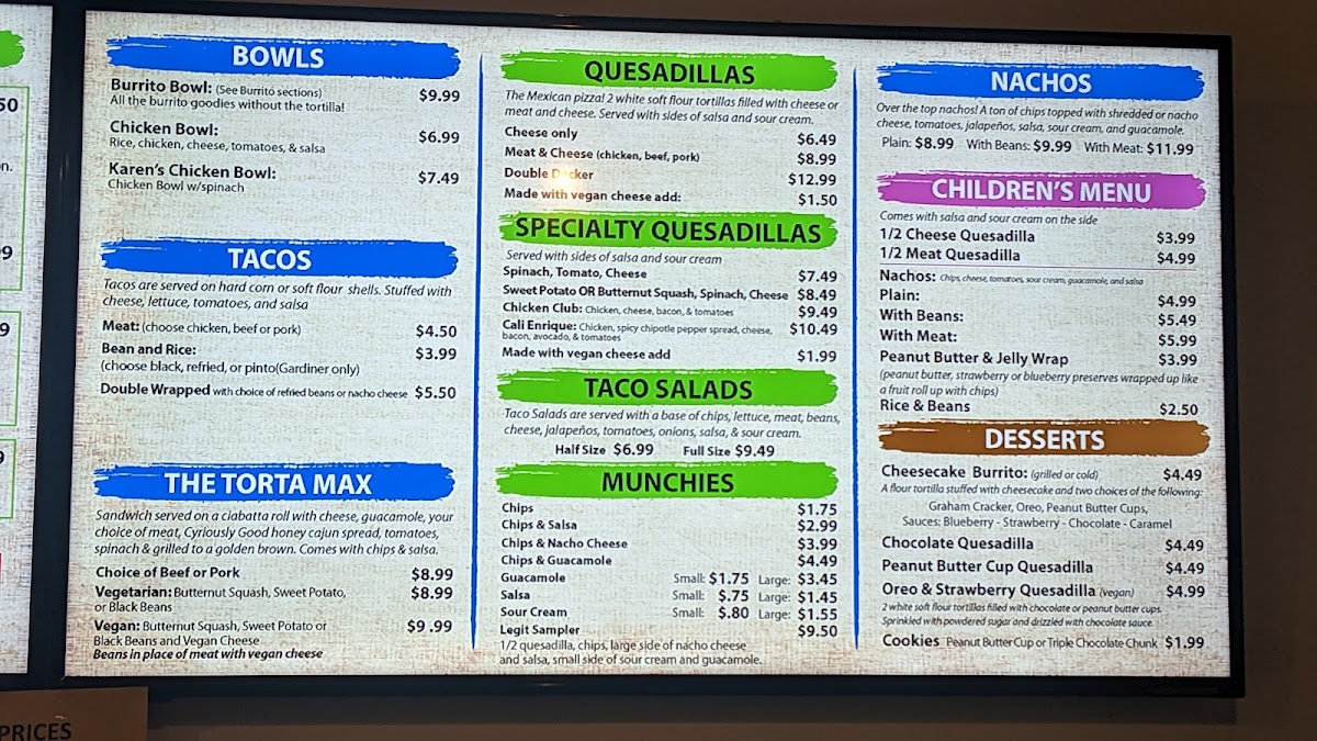 The menu features a variety of burritos, from classic options with grilled chicken or beef with refried beans to more inventive choices like the Maximum Crunchimus or vegan-friendly varieties filled with seasonal vegetables. Bowls and tacos add versatility, perfect for those looking for lighter or shareable options alongside sides that complement each meal.